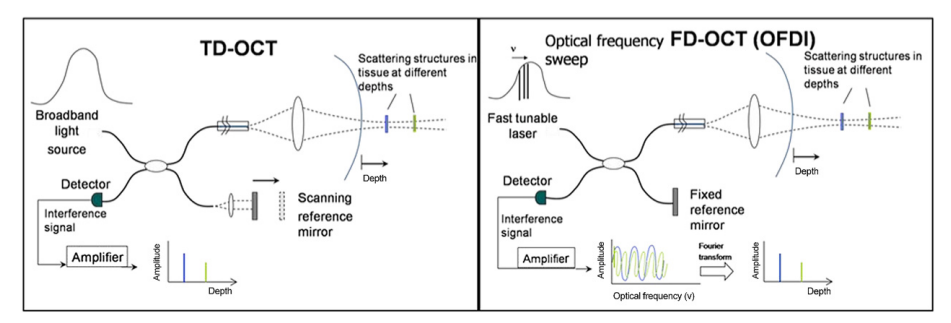 時(shí)域光學(xué)相干斷層掃描(TD-OCT,左圖)和頻域或傅里葉域光學(xué)相干斷層掃描的示意圖 (FD-OCT,右圖描述了FD-OCT的一個(gè)亞型,稱為光頻域成像[OFDI OCT])。這兩個(gè)系統(tǒng)都使用一個(gè)參考臂和一個(gè)干涉儀來檢測(cè)光的回波時(shí)間延遲。干涉儀使用分光鏡,將光分成測(cè)量臂(組織樣品)和參考臂。 在TD-OCT中,參考臂被機(jī)械地掃描(通過一個(gè)移動(dòng)的鏡子),以產(chǎn)生一個(gè)隨時(shí)間變化的時(shí)間延遲。在FD-OCT中,因?yàn)楣庠词菕哳l的,所以干擾的程度是不一樣的。 在FD-OCT中,由于光源是掃頻的,2個(gè)光束(組織和參考)的干涉根據(jù)頻率的不同而振蕩。在這兩個(gè)系統(tǒng)中,信號(hào)的干擾最終提供振幅和頻率數(shù)據(jù)。在FD-OCT系統(tǒng)中,所有的回波延遲都是同時(shí)獲得的,這使得圖像采集的速度大大增加。 顯著提高圖像采集的速度。